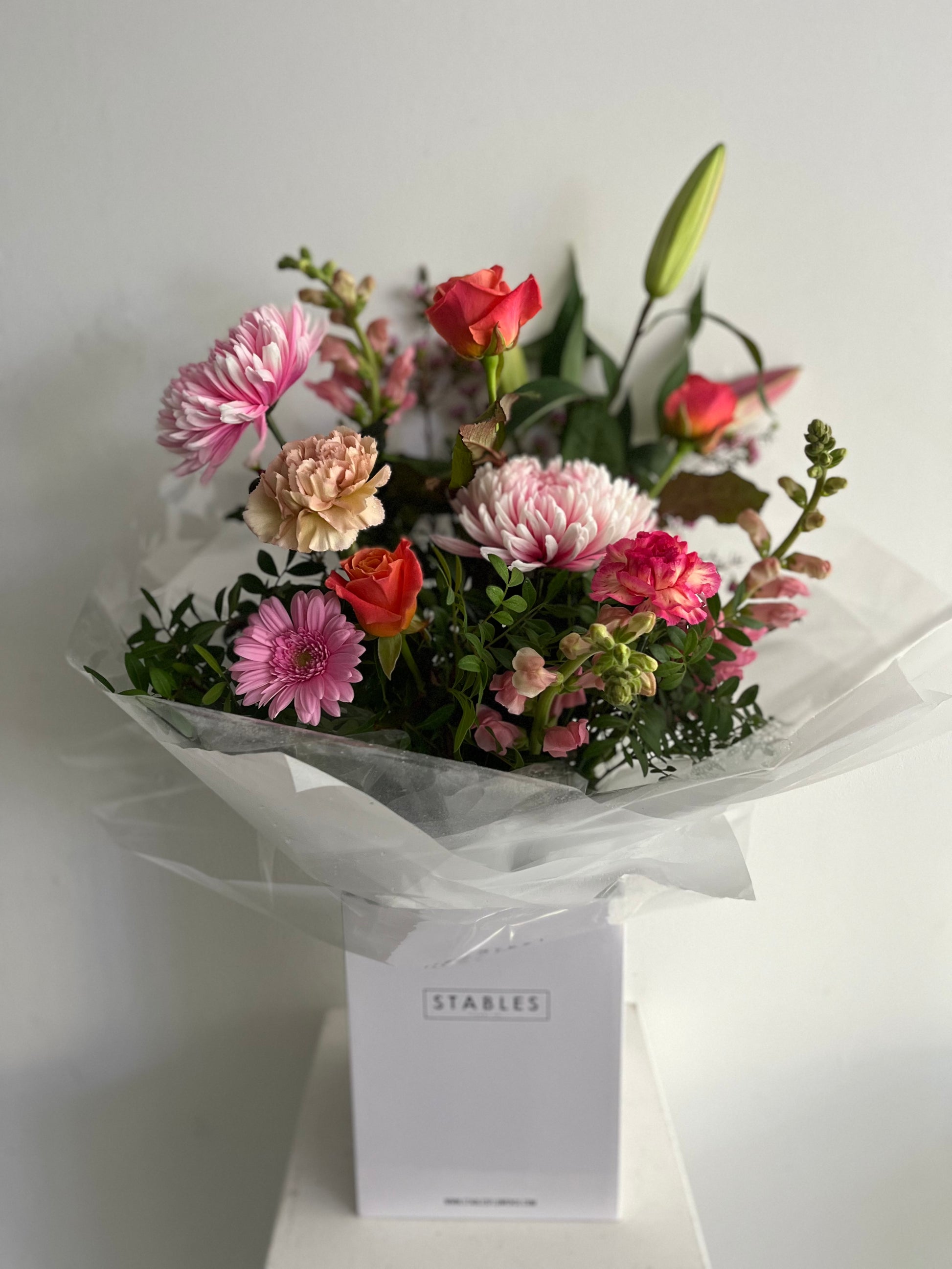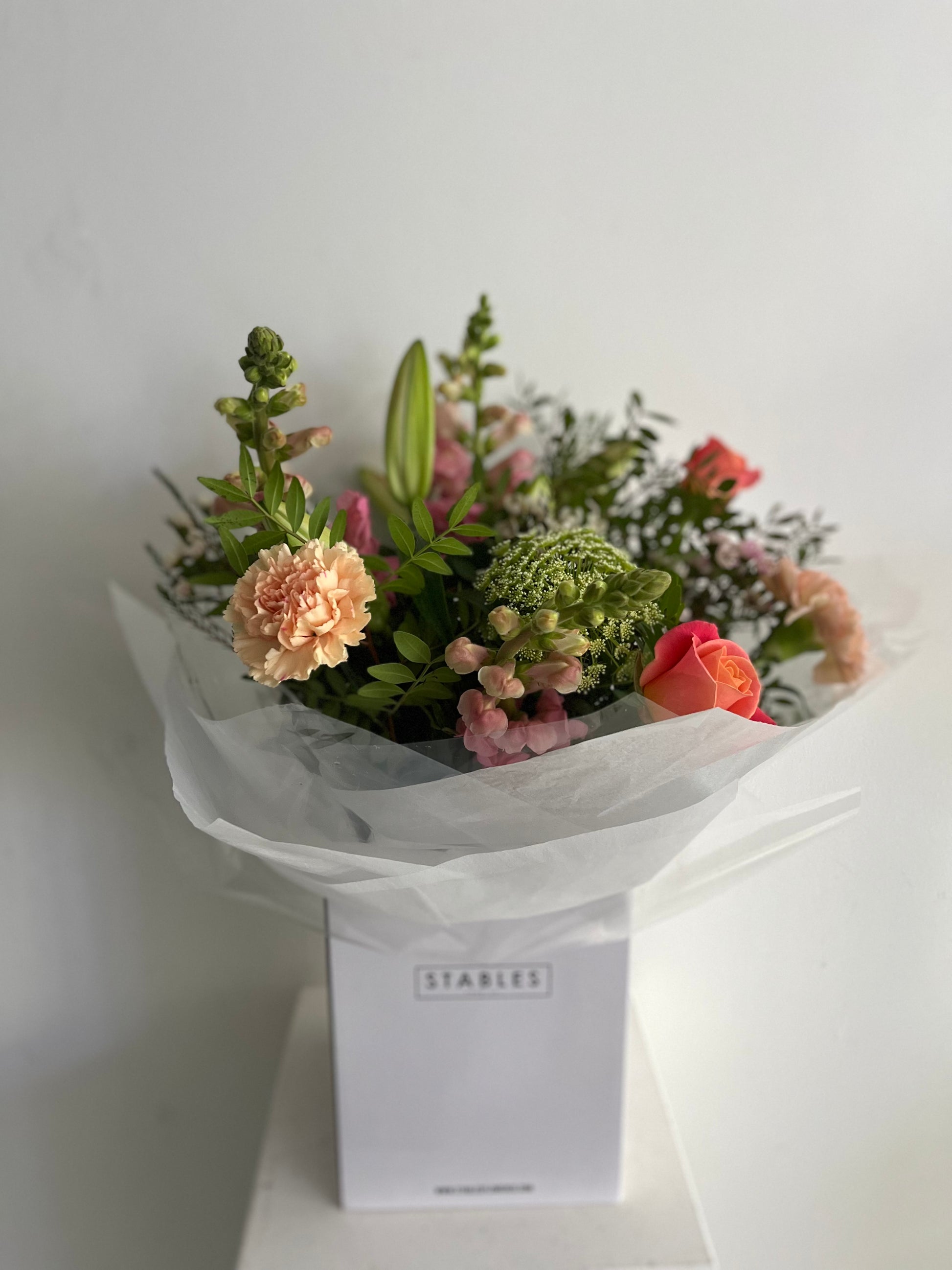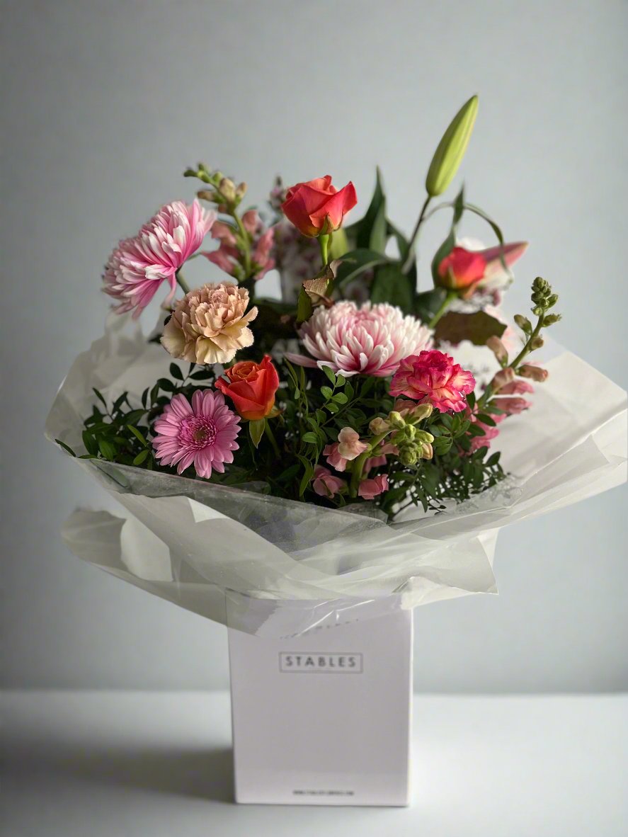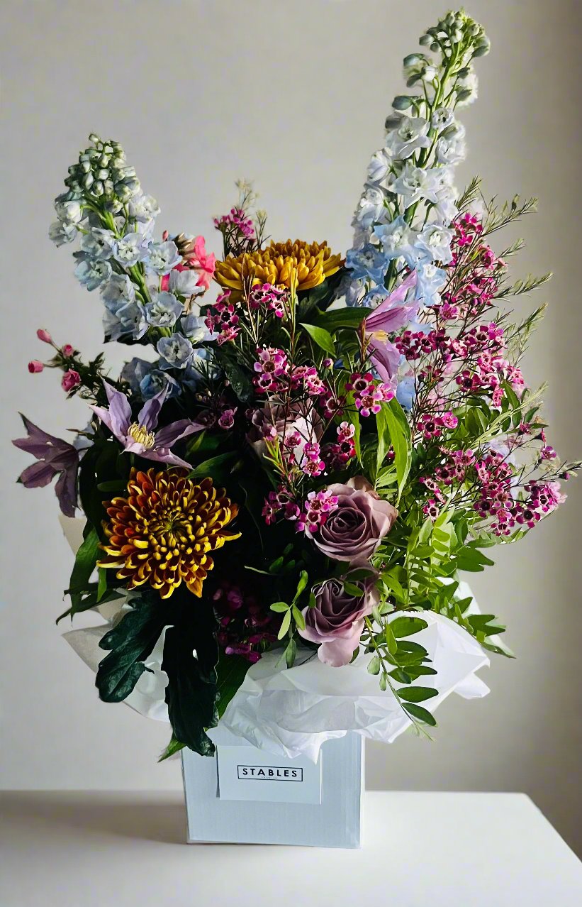Your Designer’s Choice Bouquet comes elegantly wrapped in our signature white Stables box, ensuring a stylish presentation from the moment it arrives. To keep your flowers fresh, we include a temporary water supply, so they stay hydrated until you are ready to display them. Whether its a gift or a treat for yourself, this bouquet is designed to impress from the very first glance!